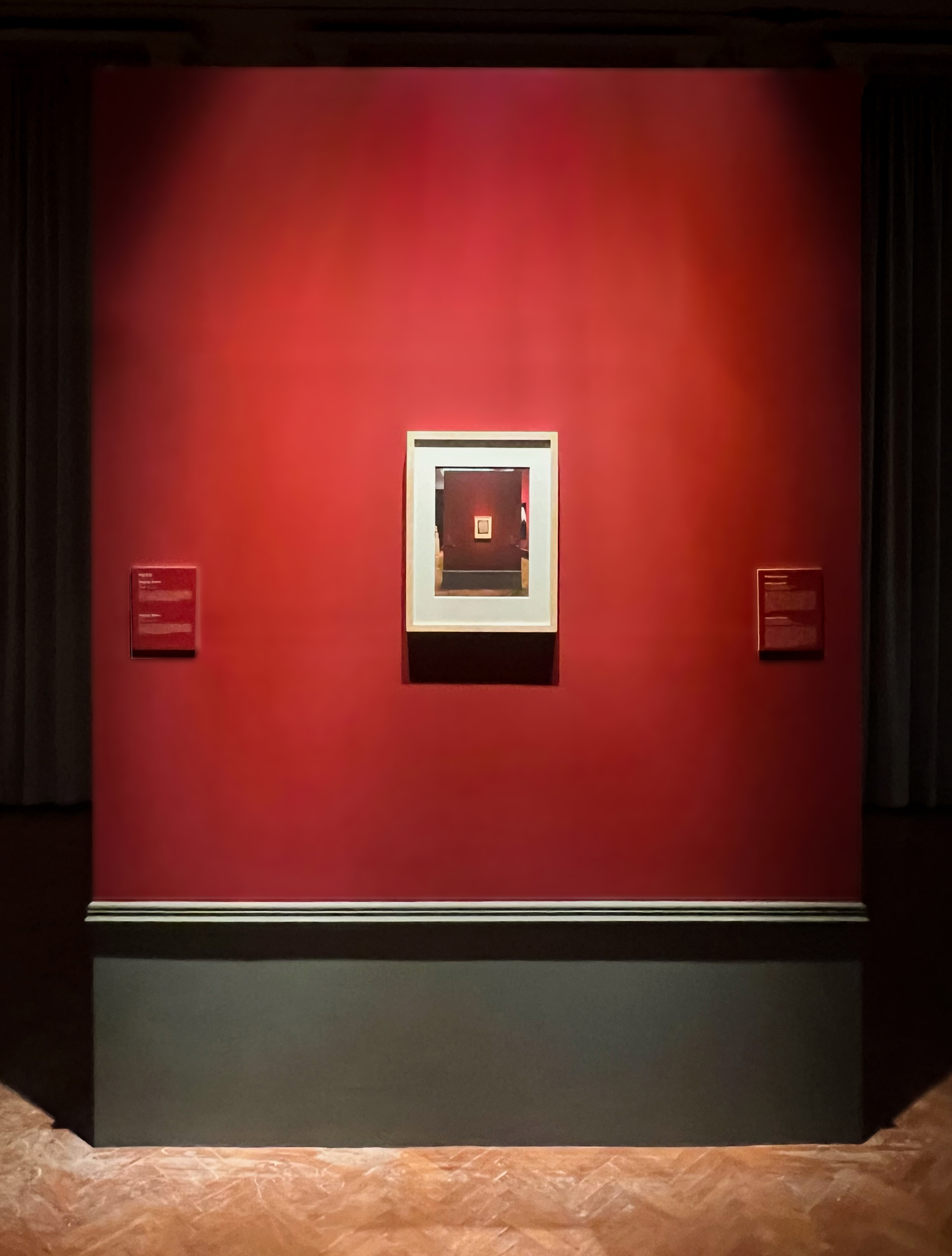 The Angel was mounted on a specially erected, giant burgundy-red wall, supported by oversized grey skirting that functioned almost as a second frame. A security guard stood next to the wall at all times, and the alarm was triggered easily (I accidentally set it off a few times).